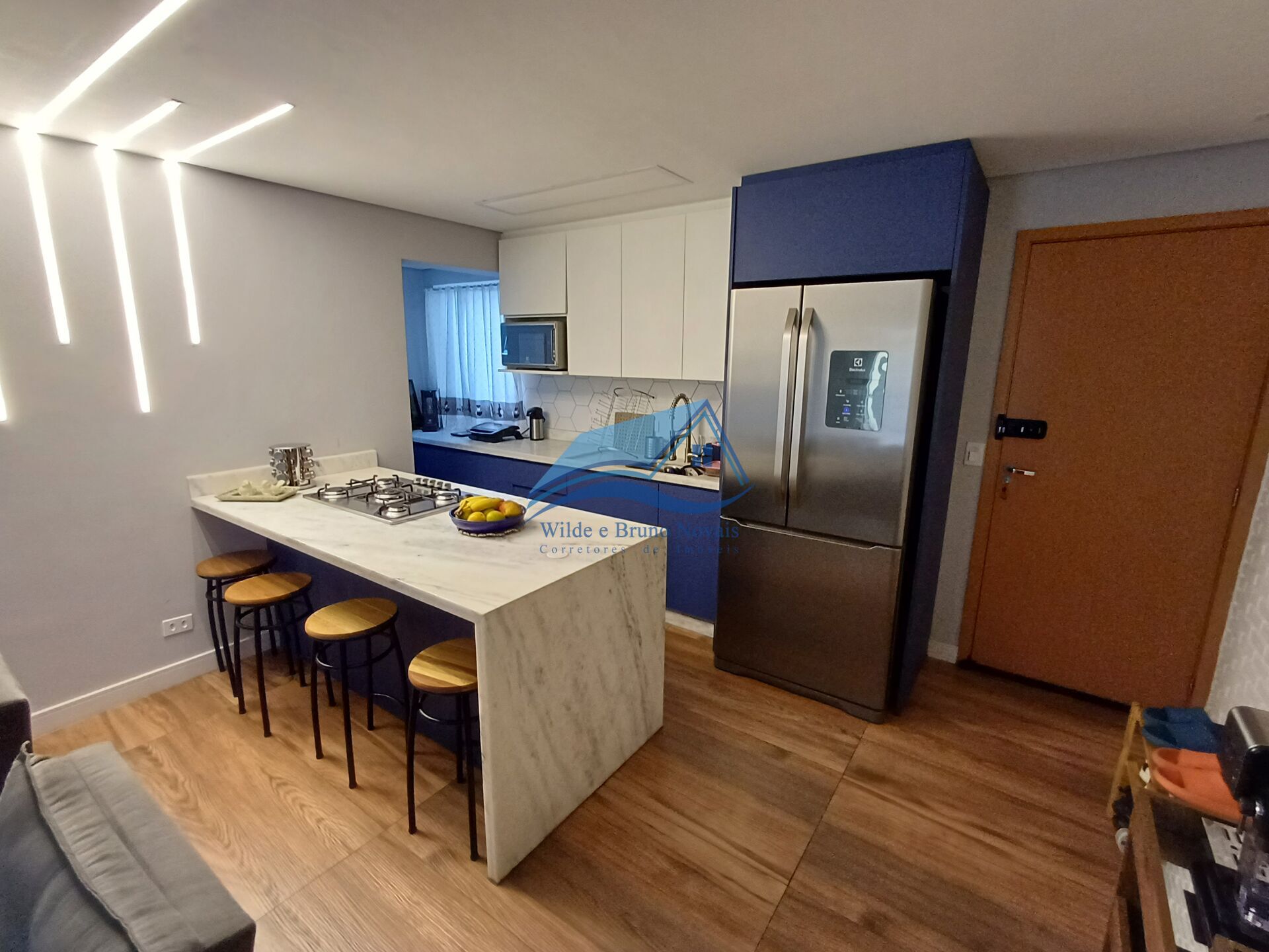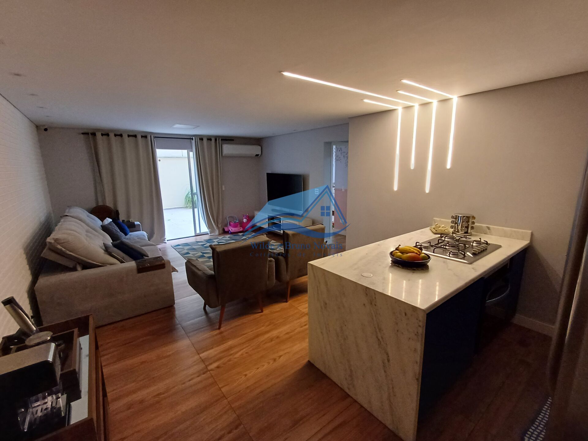 Sala ampla para 2 ambientes, cozinha americana com armários planejados, linda bancada em granito. Fogão cooktop e forno embutido.