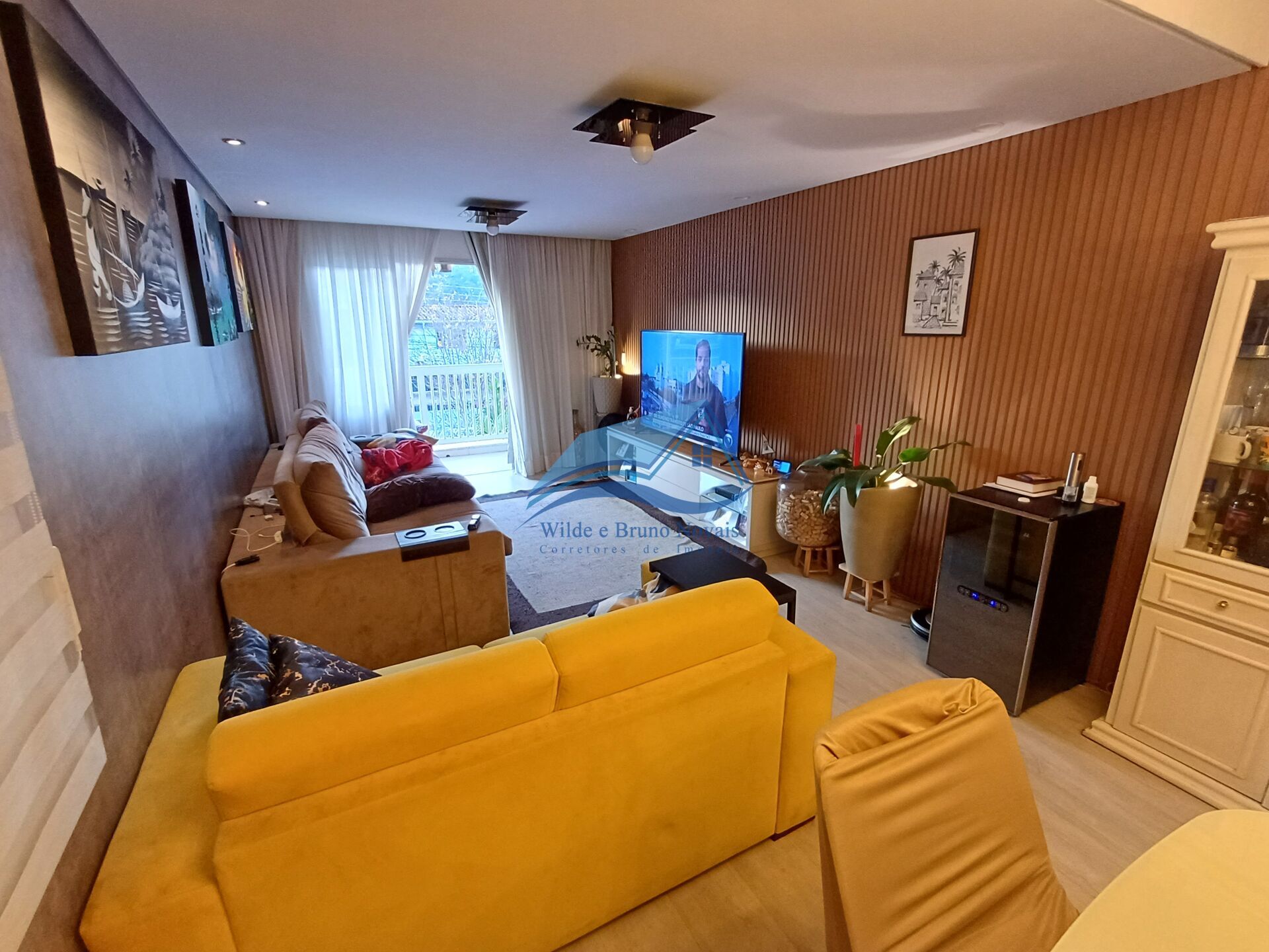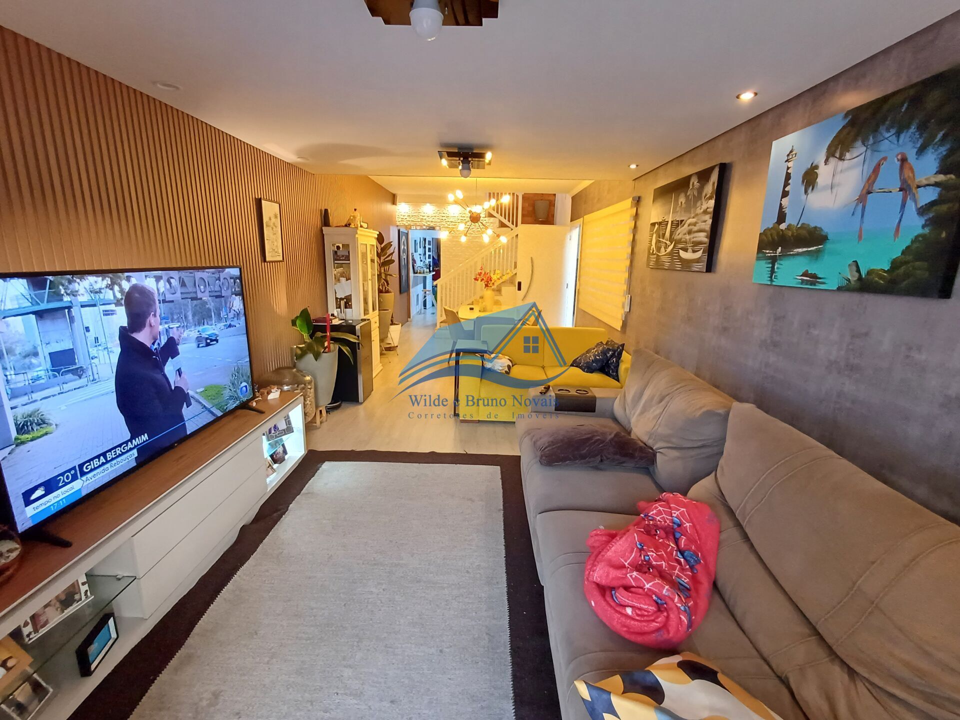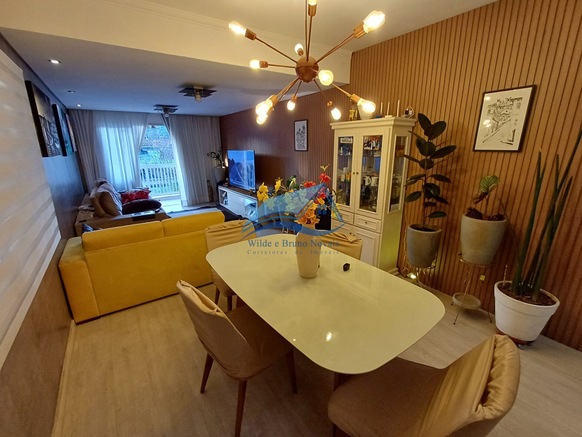 Sala ampla para ambientes com lindo ripado de marcenaria, teto rebaixado em gesso, lavabo, cozinha com armários planejados.