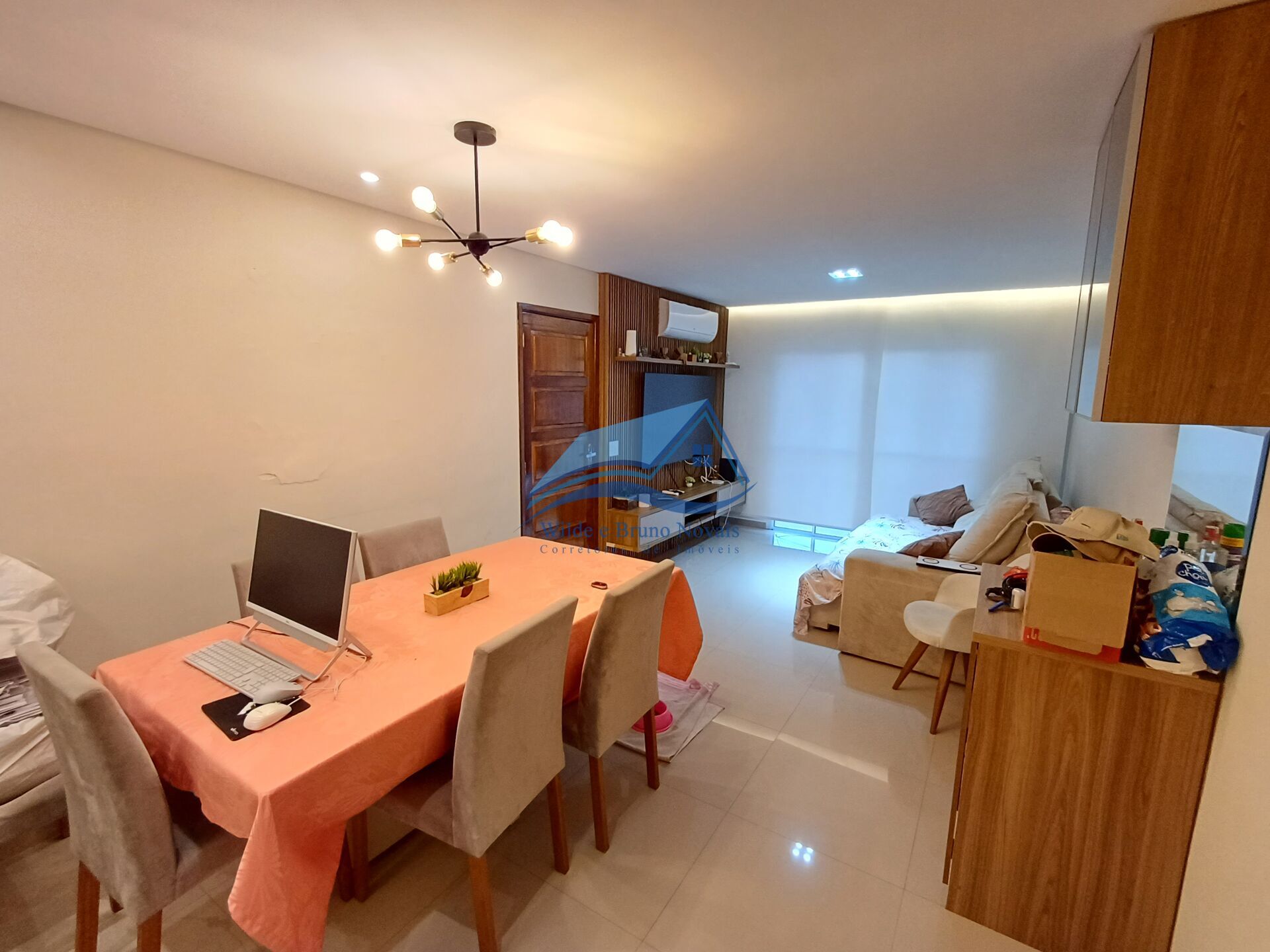 Sala para 2 ambientes com planejados, teto rebaixado em gesso, iluminação embutida, varanda e ar condicionado.